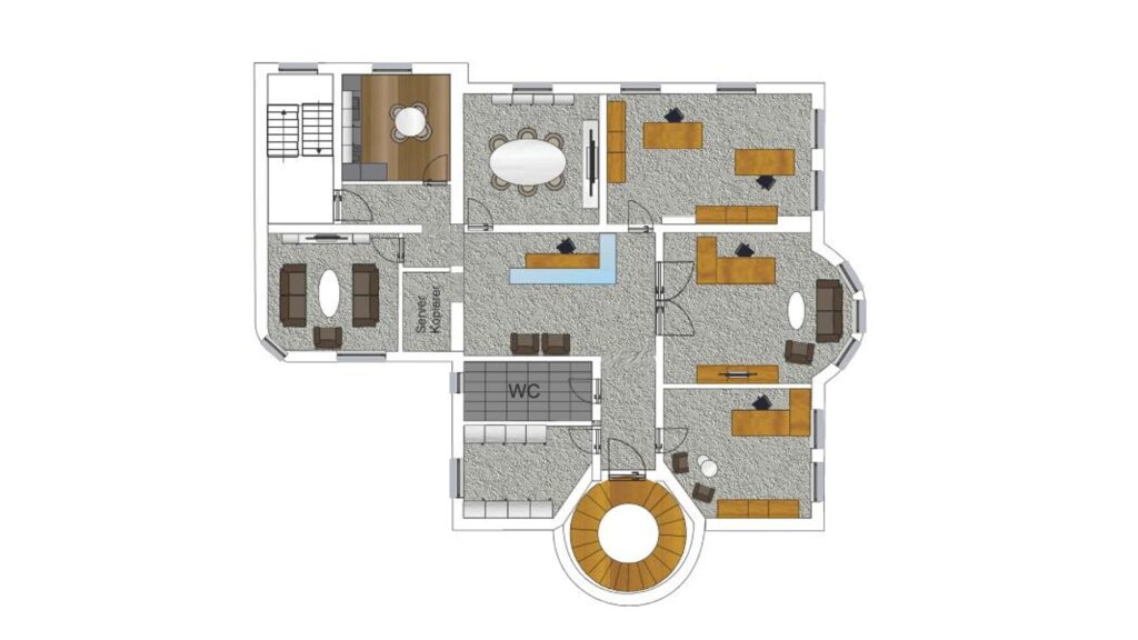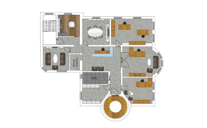 Empfangsbereich/Sekretariat mit Wartebereich, 6 Büroräume, 2 separate WC-Einheiten, Teeküche, Flur