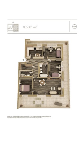5. OG : 4 Zimmer, Küche, 2 Badezimmer mit Wanne und Dusche Ausstattung: – großes Wohnzimmer mit Zugang zur Dachterrasse