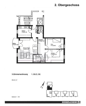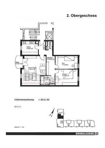 2. OG : Wohnzimmer mit Balkon, Küche mit EBK, Schlafzimmer, Kinderzimmer, innenliegendes Bad , Gäste-WC, Flur